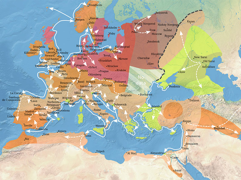 The traditional consensus is that the Black Death was bubonic plague, caused by a particularly nasty strain of a bacteria with the fancy scientific moniker of yersinia pestis. Some modern scientists and historians have questioned this diagnosis, instead arguing the Black Death was some illness that no longer exists, was another disease like typhus or anthrax, or was the bubonic plague, just with help from another biological agent like a widespread toxic microfungi that weakened the immune system. But there’s less debate over how the Black Death travelled. It may have started in the steppes of Central Asia or the Gobi Desert and travelled along the Silk Road to the port city of Caffa on the Black Sea, which was then controlled by Genoa. And from there, the plague hitched rides on ships to Constantinople, Sicily, the French Riviera, and of course northern Italy through Genoa. Estimates vary, but many settle on the average death rate being 20 percent with local death tolls as high as 40 and 50 percent.