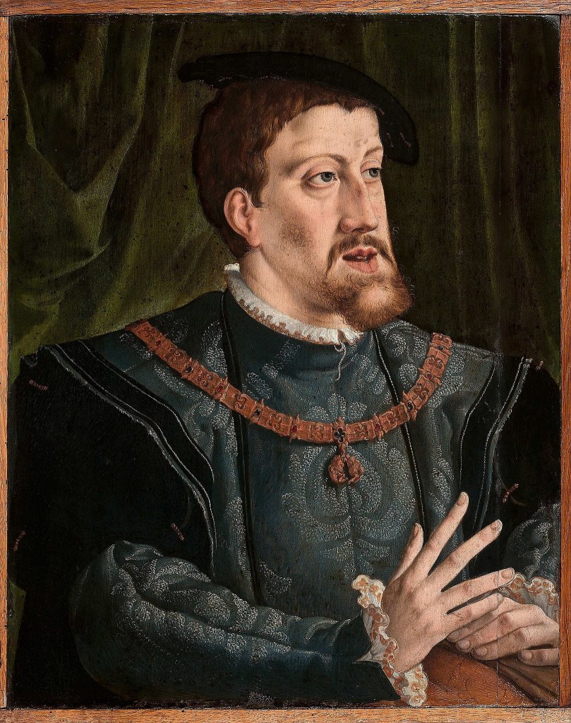 Also Charles did not cut as fine a figure as Francois or Henry. For starters, he was not physically fit and was rather sickly. Plus he had the infamous Hapsburg jaw, which caused his lower jaw to jut out. You can even see the jaw in several portraits of the emperor, one of which I’ll post on the website. According to one story, Charles V was riding through the Spanish countryside when a farmer shouted to him, “Your Majesty, shut your mouth! The flies in this country are very insolent.” Charles will come to play a very important role in the Medici’s story.