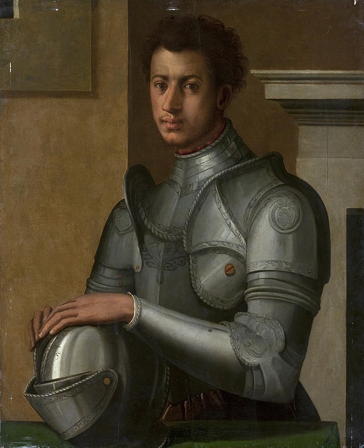 At the same time, there was a change in the air. The disaster of the Siege of Florence, the rise of Duke Alessandro bringing an end to the wars, and the fact that the last true republic quickly turned into a busybody authoritarian regime had thoroughly discredited the anti-Medici cause. The Florentine coinage ditched the old republican symbols, like the lily and the image of John the Baptist, the city’s saint, and replaced them with the head of Alessandro on one side and the Medici family saints Damian and Cosmas on the other. The shift even manifested in fashion. Florentine upper-class men began growing beards instead of being clean-shaven like old Roman patricians and started dressing in the colorful, ostentatious clothing of French and Spanish nobles. While Jacopo da Portono’s portrait of Duke Alessandro shows him dressed like a Florentine patriarch, he was also painted in armor, showing off his noble status.